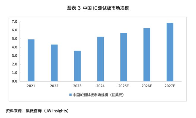 集微咨询预计,2025年中国IC测试板市场规模为5.7亿美元,占全球市场规模的15.3%,预计到2027年中国IC测试板市场空间将达到6.8亿美元。随着中国半导体晶圆制造、封装测试能力和技术的共同发展,预计中国IC测试板市场规模占全球比重将进一步提升。