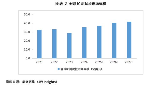 IC测试板市场直接受益于晶圆制造与封装测试产能的扩张和技术演进。一般而言,晶圆测试的需求与晶圆制造厂商的产能及稼动率直接相关,晶圆制造产能的快速提升,将持续带动探针卡市场的需求增长。另一方面,在封装产能扩张与先进封装技术发展的推动下,对负载板与老化板的需求也持续攀升。全球IC测试板市场具备显著增长潜力,集微咨询预计,2025年全球IC测试板的销售规模为37亿美元,预计到2027年全球IC测试板市场规模将达到41.8亿美元。