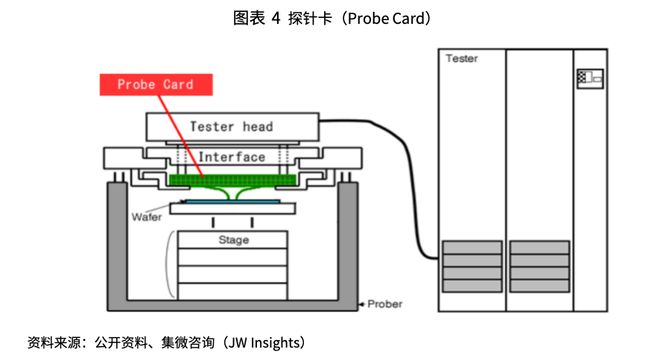 b.探针台(Prober):芯片测试平台,提供支撑、定位和步进功能。探针卡的针自动接触芯片的键合焊盘,以测量半导体晶片上的IC芯片的电特性。