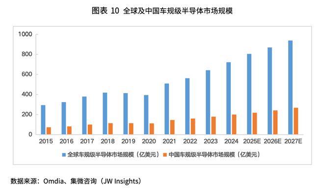 国内市场方面,受新能源汽车渗透率持续提升、单车车规级芯片价值量显著增加,以及产业政策和本土化配套能力不断完善等多重因素推动,我国车规级芯片市场规模持续扩大,预计2025年将达到约216亿美元。随着汽车电动化、智能化及网联化水平不断深化,中国车规级半导体市场仍具备较高成长性,未来复合年增长率有望保持在10%-12%,整体增速高于全球平均水平,预计到2027年市场规模将进一步提升至约266亿美元。