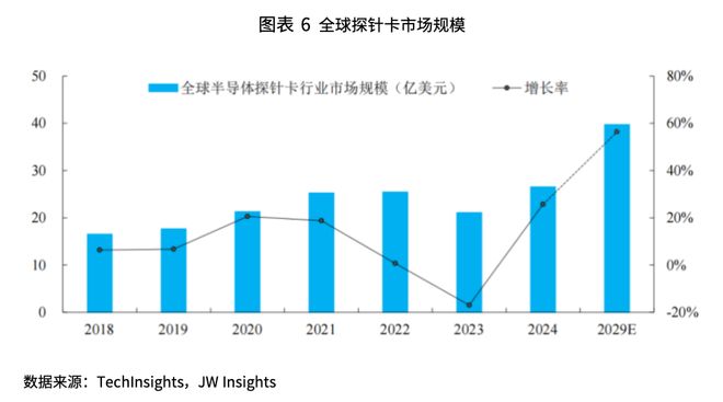 探针卡是半导体测试的核心配件之一,根据Tech Insights的数据,2018-2022 年,全球半导体探针卡行业市场规模由 16.5 亿美元增长至 25.4 亿美元。受半导体产业整体周期性波动影响,2022 年全球半导体探针卡行业市场规模增速放缓,2023 年规模收缩至 21.1 亿美元,随着半导体产业的景气度回升以及晶圆测试重要性的增加,2024 年全球半导体探针卡行业市场规模达到 26.5 亿美元,预计2029 年全球半导体探针卡行业市场规模将增长至 39.7 亿美元。