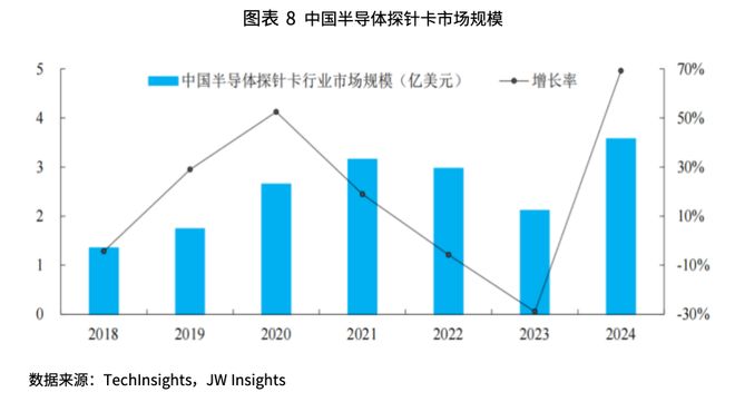 中国市场近几年快速崛起,根据 Tech Insights的数据,2018-2022 年,中国探针卡行业市场规模由 1.35 亿美元增长至 2.97 亿美元,年复合增长率达 21.8%,远超全球半导体探针卡行业同期复合增长率。随着全球半导体产业的景气度回升以及中国半导体产业的快速发展,2024 年中国半导体探针卡市场规模增长至 3.57 亿美元,同比增长 69.2%。