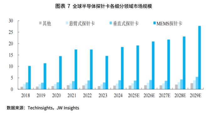 从产品结构来看,探针卡主要包括MEMS、垂直和悬臂等类型。其中,MEMS探针卡凭借其高精密度、高效率、优异耐用性与稳定性,确立了市场主流地位。据Tech Insights统计,MEMS探针卡长期占据全球60%-70%的市场份额。相较之下,垂直探针卡与悬臂探针卡的份额较小,2024年占比分别为14.85%、9.38%。Tech Insights预计,2029年MEMS探针卡仍将保持其领先的市场地位,全球市场规模将增至 27.7 亿美元。